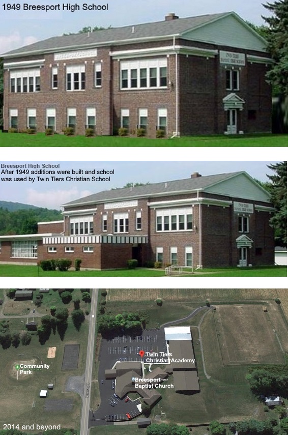 Original Breesport High School Twin Tiers Baptist High School Twin Tiers Christian Academy ![]() Former Breesport High School is now for sale. Note For Sale sign bottom right. [in 2018] |